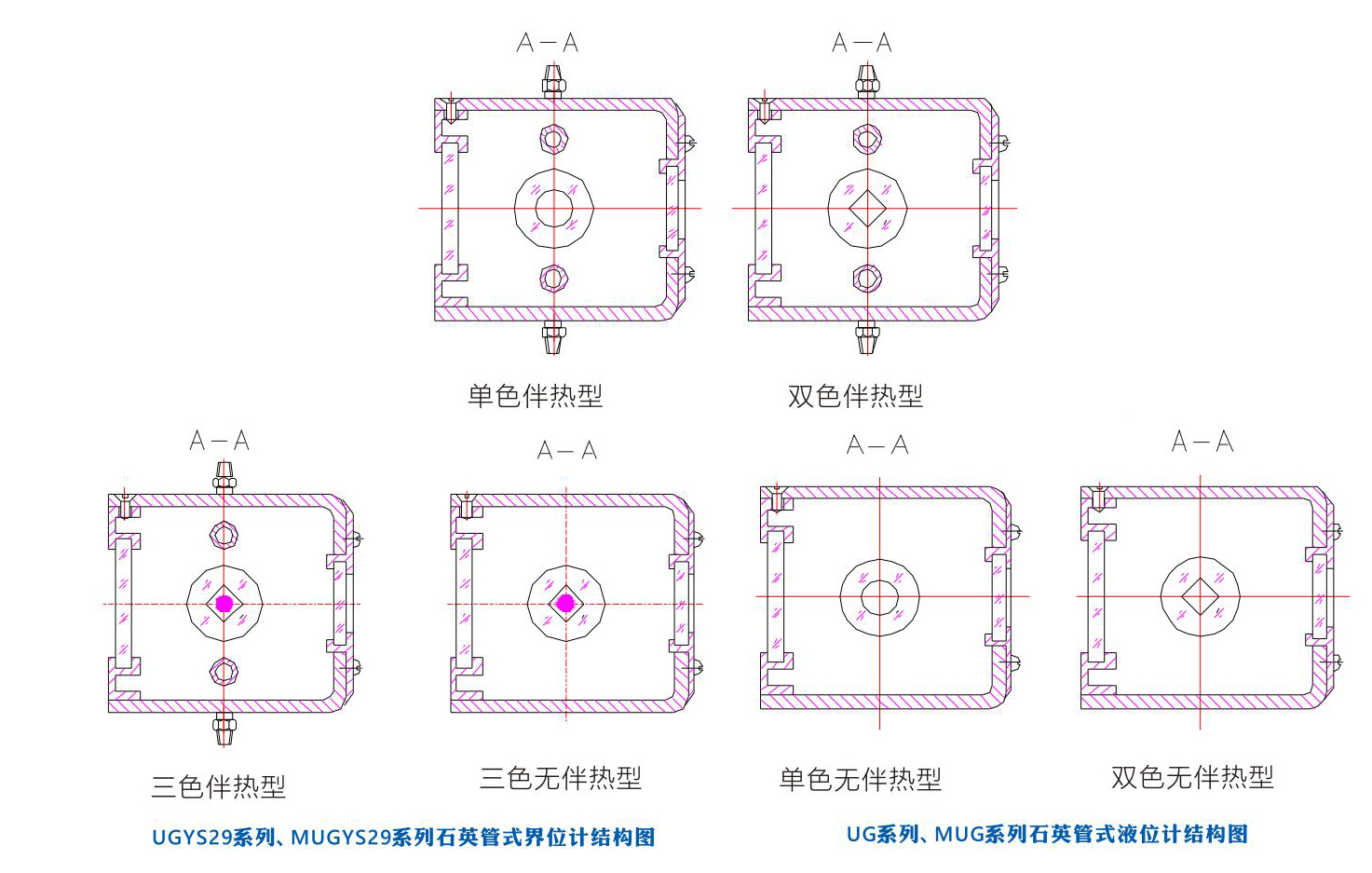 該系列產(chǎn)品按顯示效果分為單色和雙色和三色(測(cè)界位),單色顯示介質(zhì)本色;雙色則顯示汽紅液綠,液位顯示對(duì)比分明,觀測(cè)清晰;三色用于測(cè)量兩種介質(zhì)的界位,密度大的介質(zhì)顯示綠色,密度小的介質(zhì)顯示紅色,在液-液分界面上有一黑色浮子,界位顯示清晰直觀。